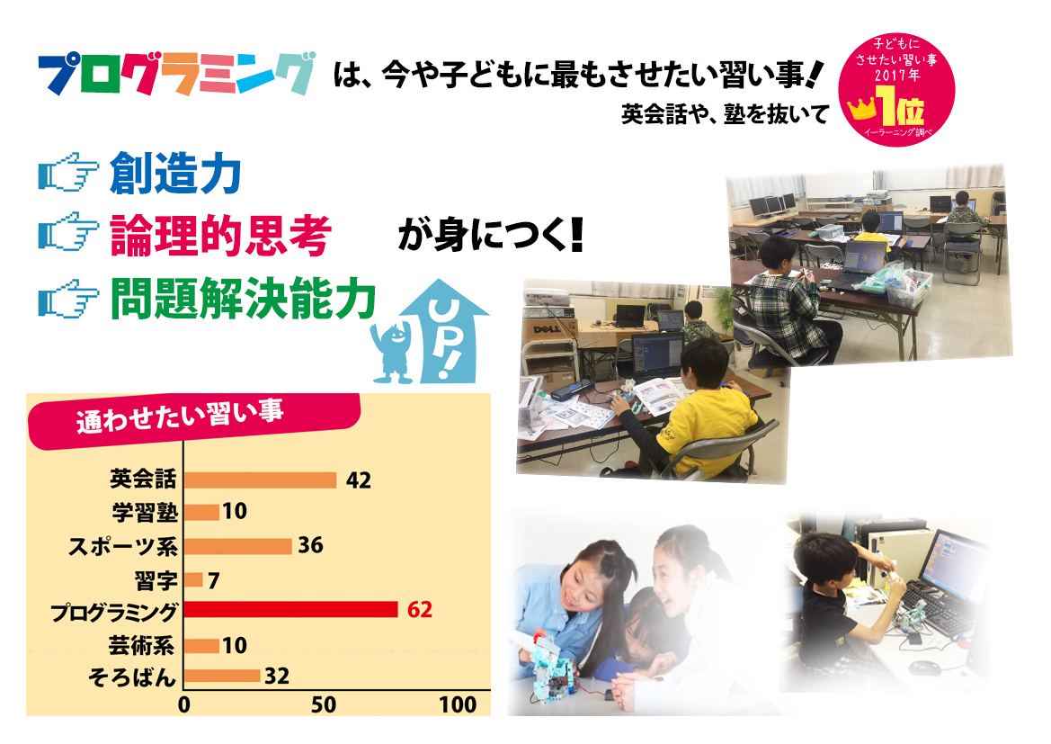 プログラミング教育は加熱を見せており、プログラミング教室自体だけではなく、英会話教室や普通の塾の中にプログラミングの時間を設けているスクールも沢山あります。はっきり言って、このビッグウェーブに乗らなきゃ損です。当スクールでも2016年からプログラミング教室を展開させています。